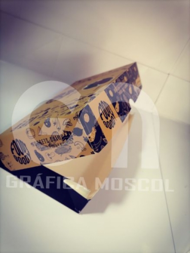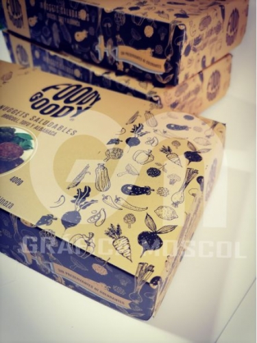 Caja para nuggets, cartulina foldcote calibre 16, impresión full color, plastificado mate en exterior y en el interior, troquelado, armado y pegado con silicona caliente.