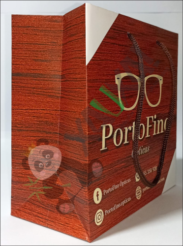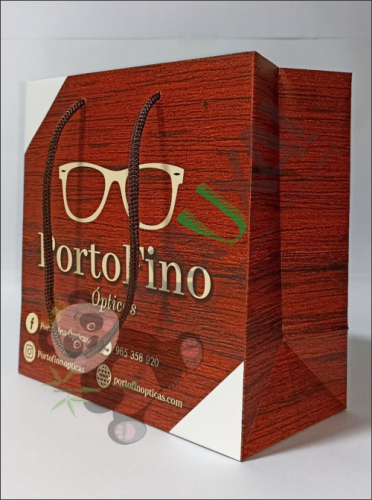 Papel couché 200 grms, plastificado mate, medidas 20 x 20 x 10 cm, impresión full color, pita marrón