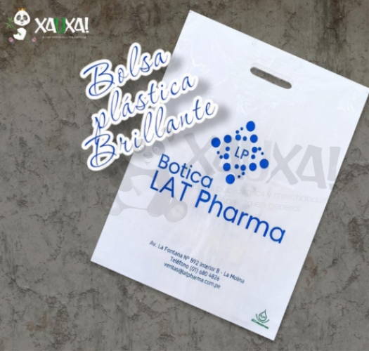 Bolsas plásticas baja densidad con asa parche 10 x 15". Medidas 38.1cm x 25.5cm, impresión 1 color. El costo aumenta S/100 por cada color adicional.